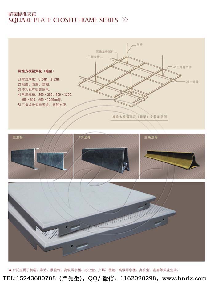 鋁單板、鋁天花、鋁板幕墻、鋁扣板、掛片天花、鋁方通、條扣天花、格柵天花、方板天花、Z型勾搭龍骨、A字龍骨、型材方通龍骨、輕鋼龍骨、烤漆龍骨、圓管天花